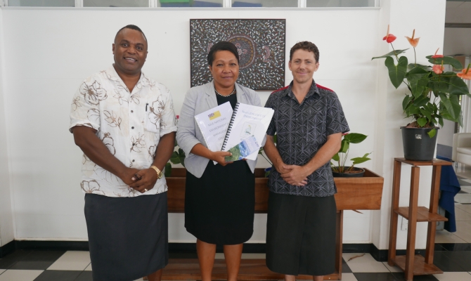1 copy copy copy copy copy copy copy copy copy copy copy copy copy copy copy copy copy copy copy copy copyThe Niue Government Associate Minister of Environment, Ms Mona Ainu'u (center) with the draft SOE Reports, NEMS and Inform brochure after the courtesy visit and briefing on the SPREP mission to Niue, with SPREP's Environmental Planning Adviser, Mr Jope Davetanivalu (left), and Mr Paul Anderson (right). Photo: SPREP